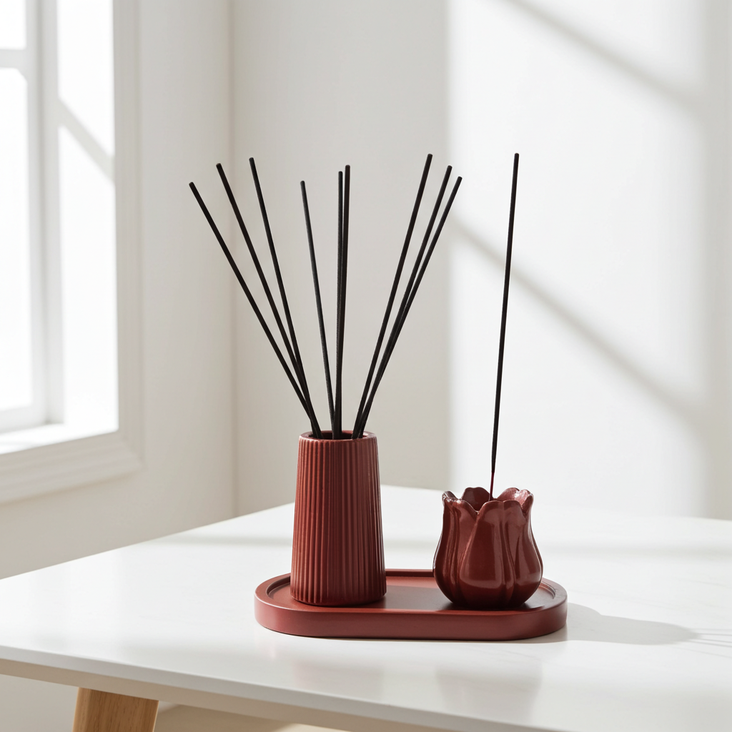 O modelo listrado se destaca pelo design marcante e pela composição equilibrada entre o vaso porta-incenso, incensário em forma de flor e bandeja decorativa, criando um conjunto funcional e esteticamente harmonioso.
